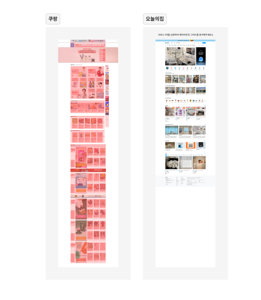 옆에는 오늘의 집 홈페이지를 그리드 분석해보려고 가져왔다. 개인적으로 카테고리 분류도 잘 보이고 여러 카드 형식이 한 화면에 보여서 좋아하는 웹페이지다!