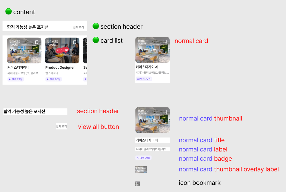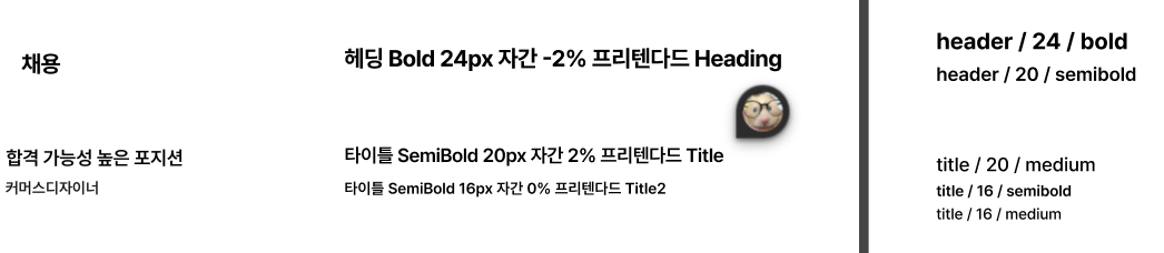 그리고 헷갈렸던 부분 4 텍스트. 이건 회사마다 헤드, 타이틀의 역할을 다르게 설정할 수 있어서 헷갈릴 수 있는 부분이라고 하셨다. 원티드에서는 전체 헤드를 타이틀로 하고 콘텐츠의 타이틀을 헤드로 스타일 지정해두어서 조금 아리까리했다.(보통 head를 title보다 큰 텍스트 네이밍으로 하기 때문이다...상위 영역이라고 해야할까?)