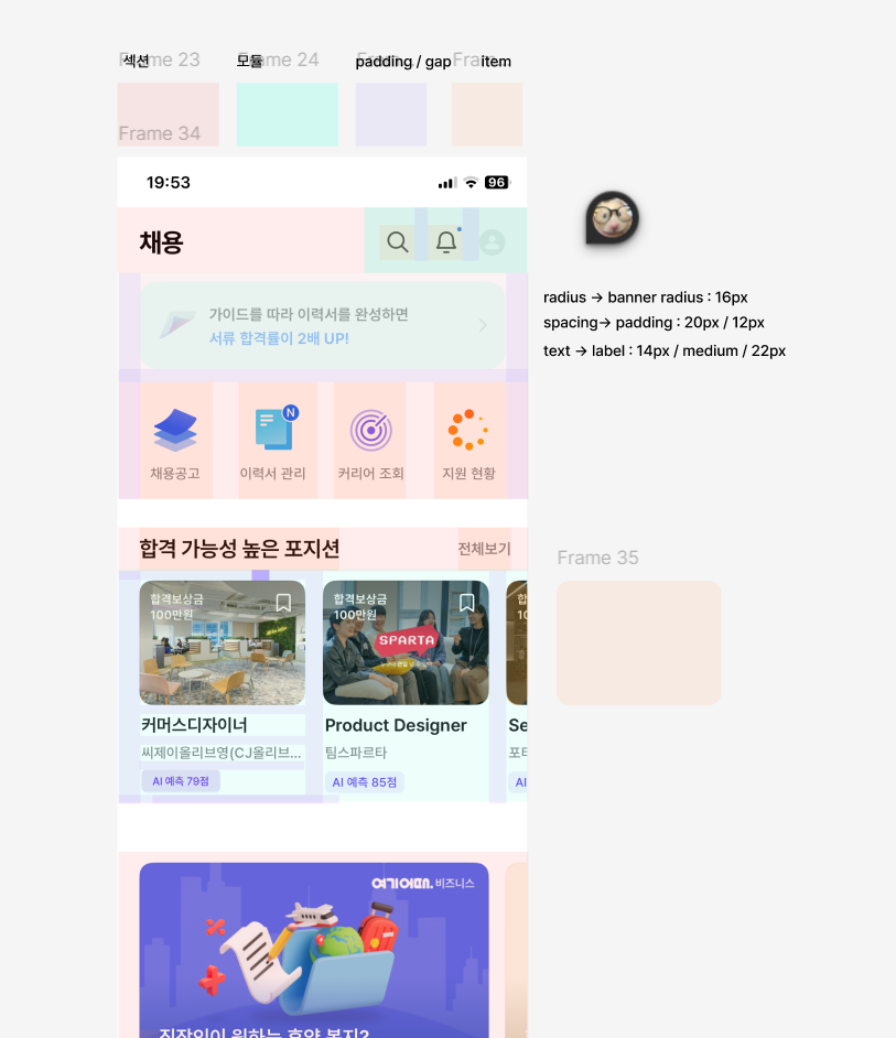 그리고 이 섹션 부분에서 좌우 패딩을 맞춰서 넣은 다음에, 화면을 구성할 때 바로 넣어서 완성되게 하는 방법을 추천해주셨다. 최종 프레임에서 전체 패딩을 넣으면 헤더의 폭이 좁아져서(스테이더스와 탑 앱바 부분) 레이아웃이 일그러질 수 있기 때문이다.