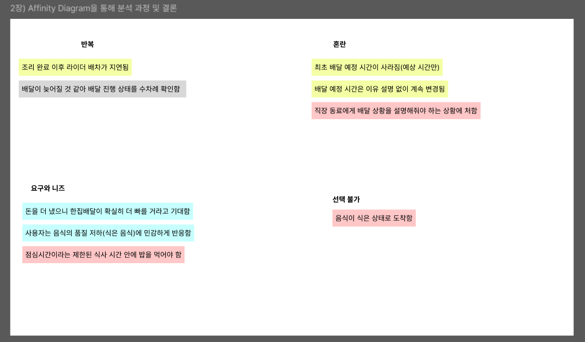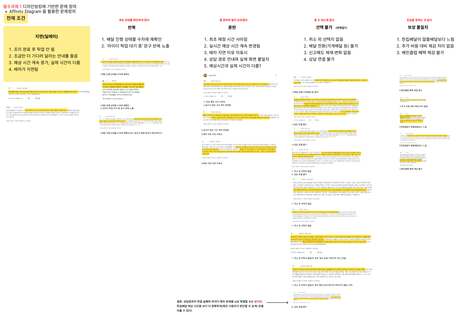 배달 지연이라는 공통된 문제에서 반복/혼란/선택불가(무력감)/보상 불일치라는 4가지 카테고리로 다시 나눠본 것.