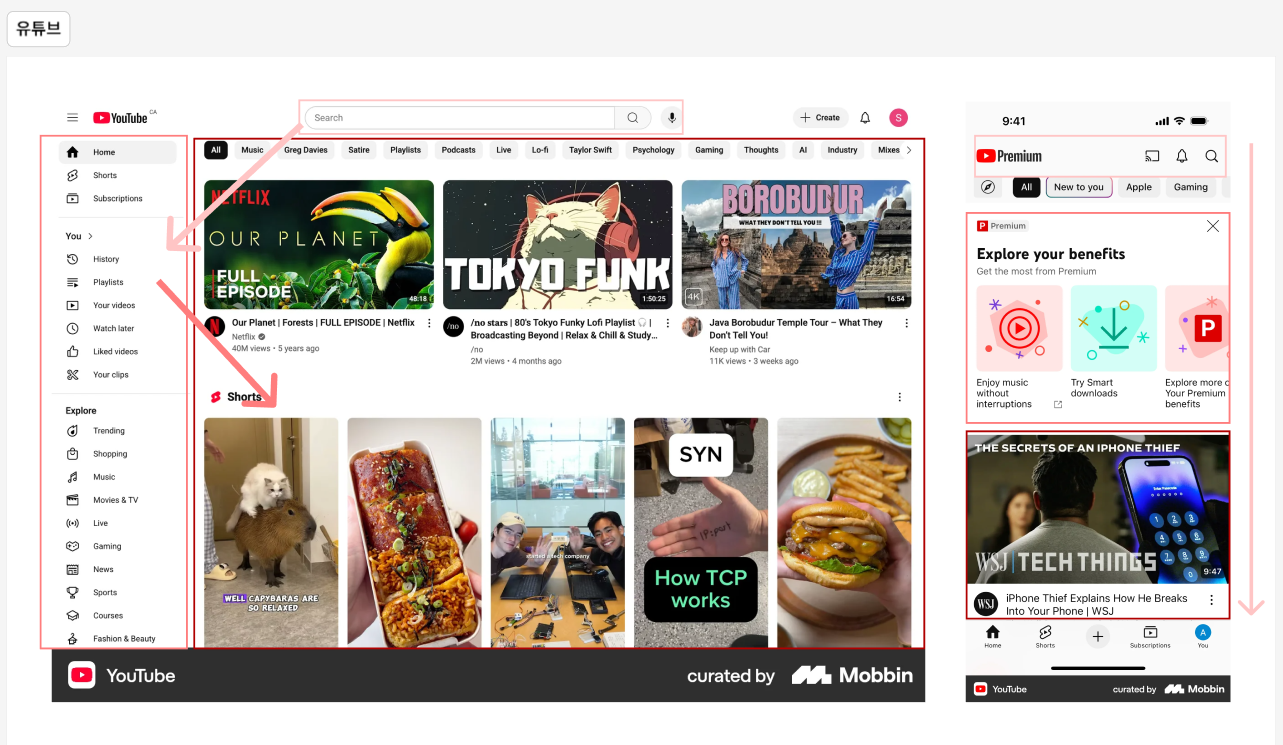 특히 홈/You는 자주 쓰는 기능이므로 하단 네비게이션 바에 배치해두었지만 Explore의 경우 카테고리 검색은 모바일에서 보이지 않는 것 같다.(부가적인 기능이 아니라고 생각해서 숨겨진 것 같음. 나도 PC 유튜브를 이용할 때 저 탐색 기능을 이용해서 해당 카테고리에 잘 들어가보지는 않은 것 같다. 워낙에 검색하면 추천 동영상이 잘 떠서...)