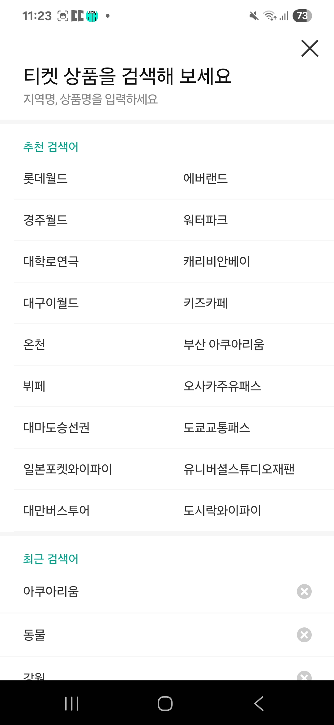 쿠팡 트래블 -> 티켓 이름을 검색하려고 입력 필드를 누름-> 검색화면이 떴으나 어디가 입력 필드인지 몰라서 화면 여기저기를 터치해봄