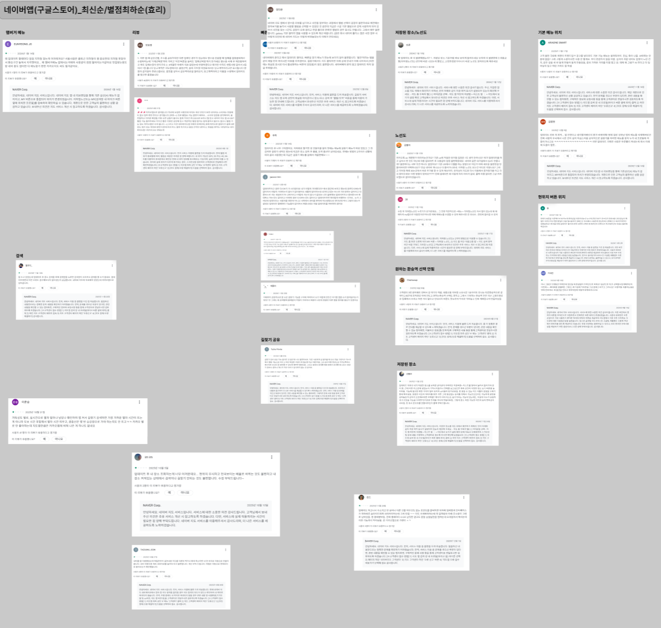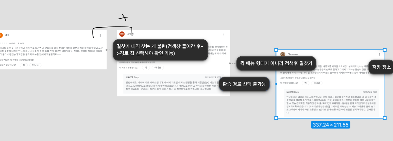그래서 각자 선정한 리뷰 중, 나는 총 3개의 리뷰를 1차로 가져왔다. 사용자들이 길찾기 내역 확인이나 길찾기 기능 바로가기에 대해 반복적으로 불편을 제기하고 있었고, 공감 수 또한 높아 많은 사용자가 문제로 인식하고 있는 기능이라고 판단했기 때문이다. 또한 길찾기 기능은 지도 앱의 핵심 기능 중 하나이기 때문에, 사용성이 떨어질 경우 사용자 경험 전반에 미치는 영향이 크다고 보았다.
