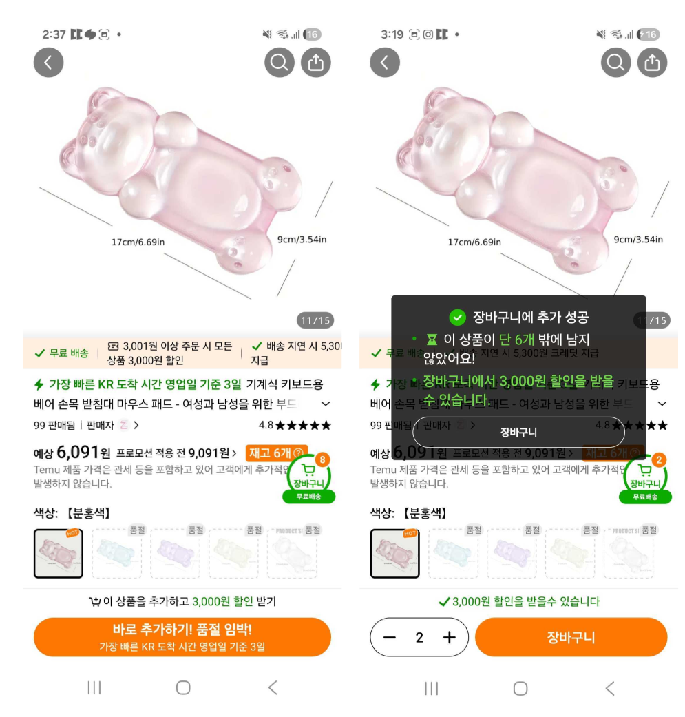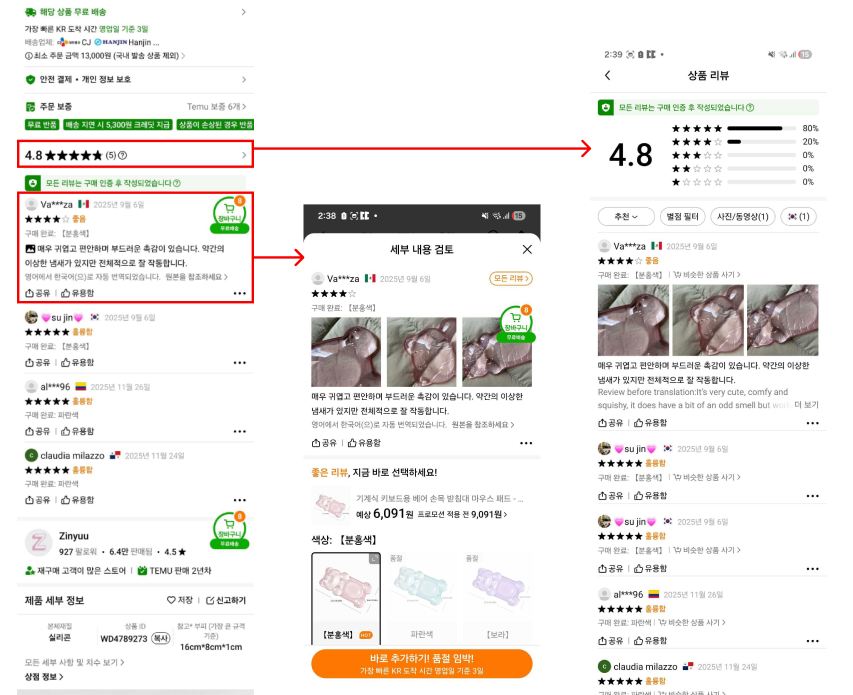 저렴이 상품을 파는 해외 커머스 어플을 쓸 때는 실물 사진 확인이 필수적인데 바로 사진이 안 보이는 게 조금 불편했다. 그리고 리뷰가 4개 정도 쫙 아래로 나열되어 있어서 상품 상세 페이지를 보려면 아래로 스크롤을 많이 해야하는 게 답답하게 느껴질 수 있는 부분이라고 생각했다. 이외에도 테무 앱 보면서 느낀 점이 있지만 대표적인 것은 이정도?