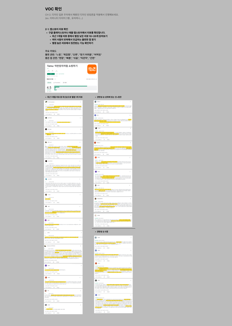 테무(이외 커머스 앱도 ok) 리서치 -> 인터뷰, 설문조사 -> 개선 아이디어 도출 -> 클론 디자인 및 개선안 제작