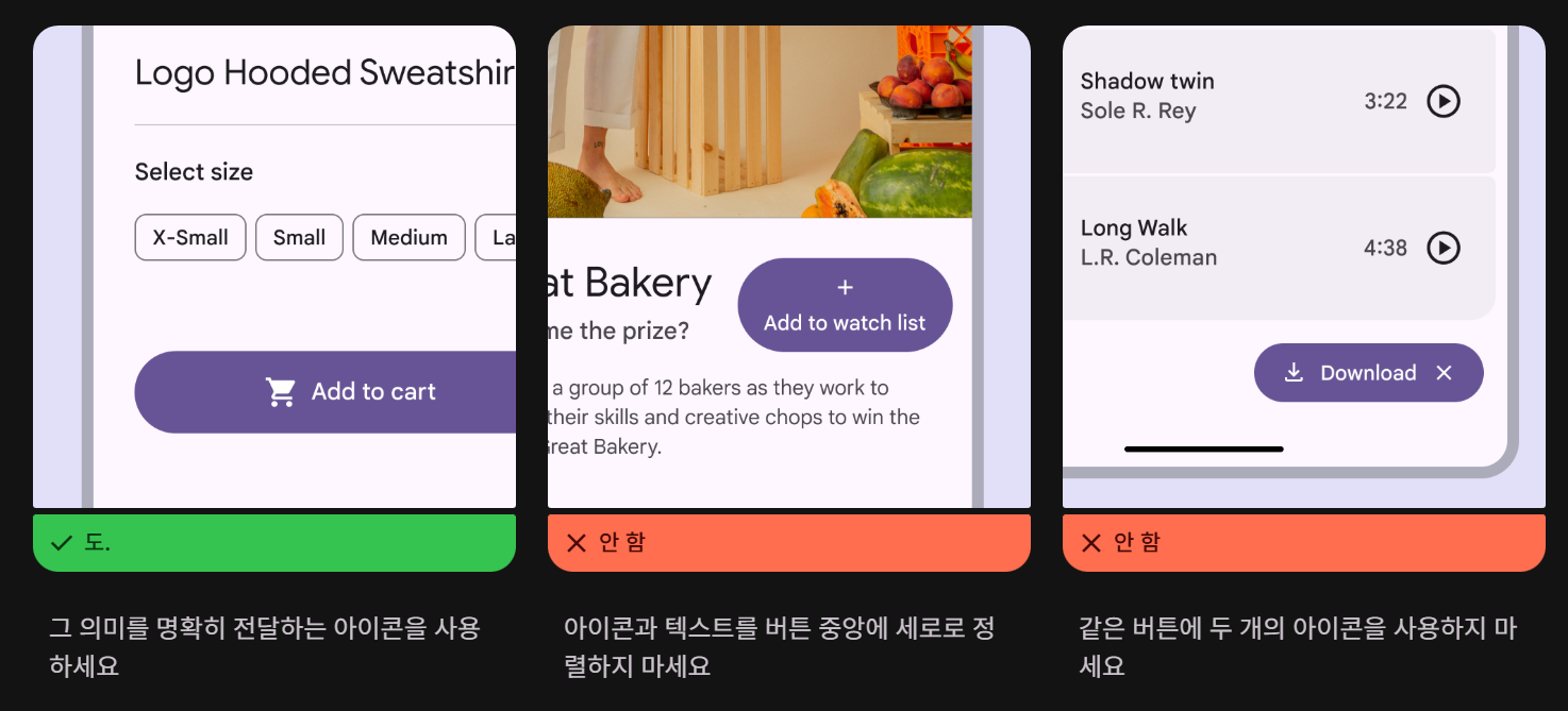 ❷ 채워진 버튼 (Filled) / 강조 효과가 커서 한 페이지에 한 개 권장