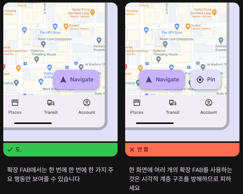 - 결제 화면과 같이 지속적인 작업 접근이 필요한 긴 스크롤 뷰 화면에 확장 FAB를 사용