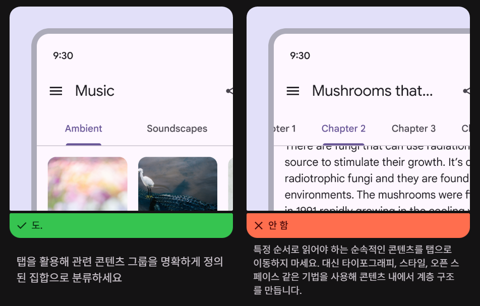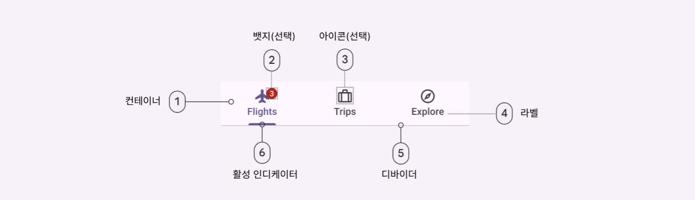 - 두 가지 유형: 프라이머리 탭 (주요 탭, 콘텐스 상단에 배치), 세컨더리 탭(보조 탭, 콘텐츠 영역 내)