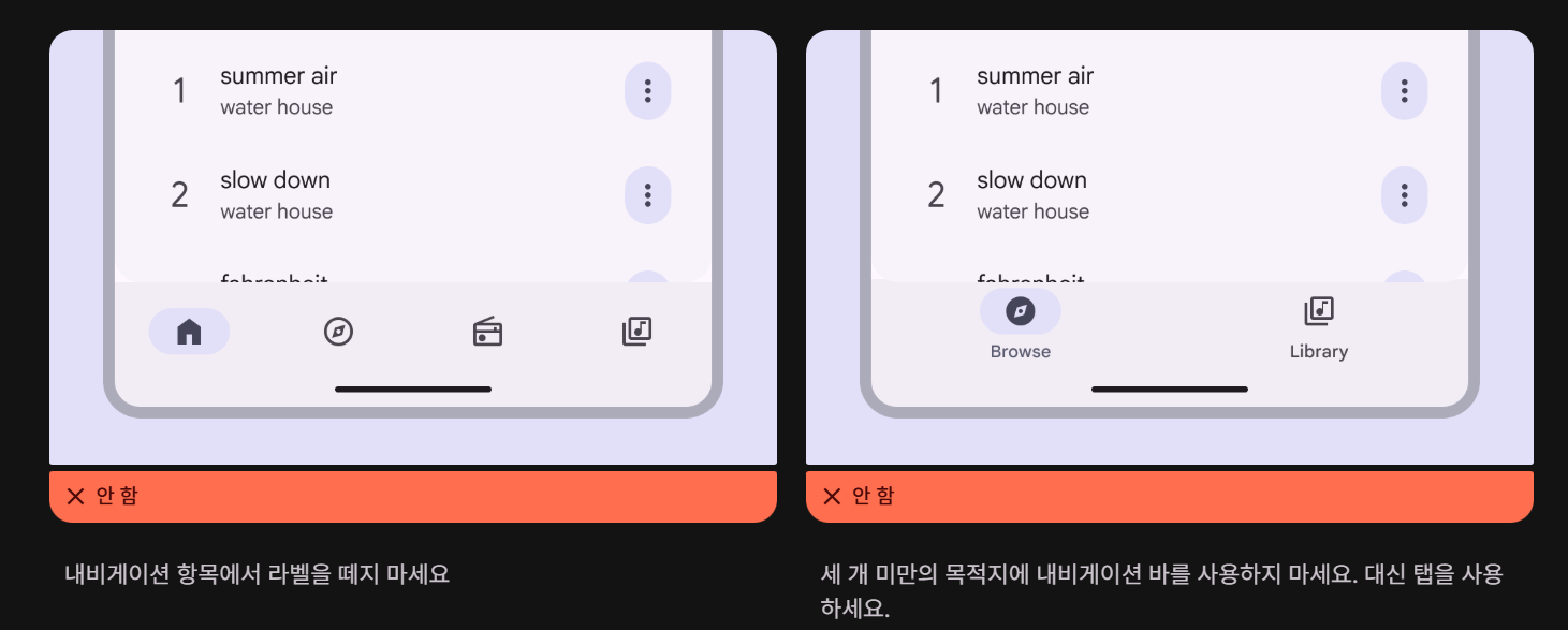 - 동일한 중요도를 가진 3~5개의 탭